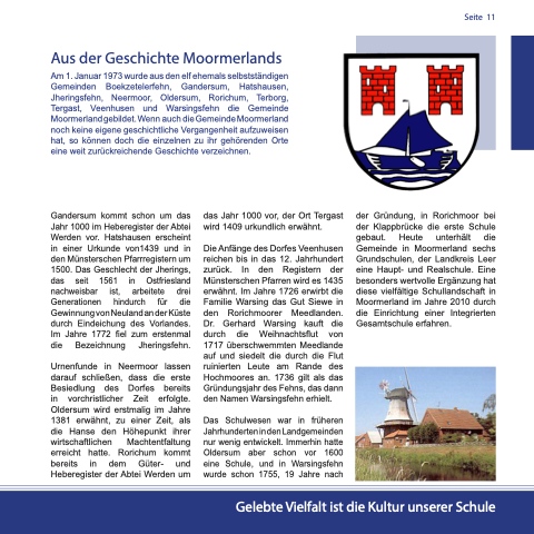 der Gründung, in Rorichmoor bei der Klappbrücke die erste Schule gebaut. Heute unterhält die Gemeinde in Moormerland sechs Grundschulen, der Landkreis Leer eine Haupt- und Realschule. Eine besonders wertvolle Ergänzung hat diese vielfältige Schullandschaft in Moormerland im Jahre 2010 durch die Einrichtung einer Integrierten Gesamtschule erfahren.